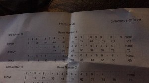 So, my friends picked me up, I hopped in the car, we got pizza, and went bowling, and I would like to add that I kicked ass- thank you very much! I broke 100 points in my first game!